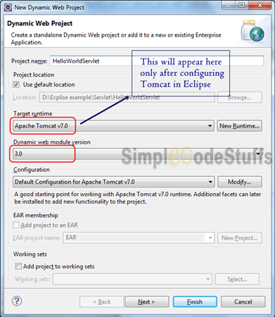 Start your Eclipse and then go with File > New > Dynamic Web Project and enter project name as HelloWorldServlet and set rest of the options as given in the following screen: